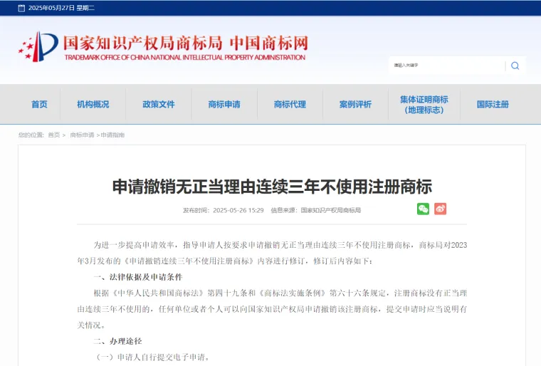 2025年5月26日,商標局官方發布商標撤三的最新具體要求(點擊查看)。